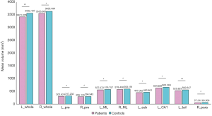 Table 2 shows the statistical analysis of hippocampal sub-regions volumes between two groups. The bilateral hippocampus in patients appear to shrinker volume compared with controls (R: F=7.488, P=0.023; L: F=16.080, P<0.001). When the hippocampus were divided into sub-regions, we found that several areas showed smaller volume in patients, including left hippocampal tail (F=16.580, P<0.001), left subiculum (F=10.800, P=0.005), left CA1 (F=11.040, P=0.005), right parasubiculum (F=7.170, P=0.023), bilateral presubiculum (R: F=7.939, P=0.022; L: F=10.220, P=0.009), and molecular layer (R: F=6.209, P=0.036; L: F=11.590, P=0.005). In other areas of the hippocampus, the difference does not reach a statistically significant level (P>0.05). Figure 2 shows the volume of hippocampal subfields with significant differences in two groups, which indicates the volume of these sub-regions decreased in patients group compared with controls.