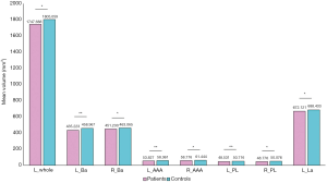 As shown in Table 3, we find a significant reduction in left amygdala volume in schizophrenic patients (F=11.164, P=0.005). Figure 3 describes the raw mean volume of amygdala sub-regions with significant decline in patients, including basal nucleus (R: F=7.278, P=0.023; L: F=18.930, P<0.001), AAA (R: F=5.701, P=0.045; L: F=16.062, P<0.001), paralaminar nucleus (R: F=8.510, P=0.016; L: F=13.604, P<0.001) and left lateral nucleus (F=8.184, P=0.017). In the remaining regions, the difference is not statistically significant (P>0.05).
