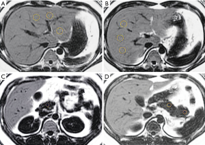 All of the enrolled subjects underwent MRI examinations using a 1.5-T MRI scanner (Brivo MR355, GE Healthcare, Chicago, IL, USA). Breathing training before MRI was performed to ensure optimal image quality. All of the patients underwent MRI scanning covering the diaphragm to the 4th lumbar vertebral body in a supine position. Three-plane localization imaging was obtained at the beginning of the examination. The IDEAL-IQ sequence was acquired with the following parameters: TR =15.6 ms, 6 echoes in each TR, TE1 =1.2–1.5 ms (increment: 1.23 ms, 6 echoes); flip angle, 8°; and slice thickness, 10 mm. The images were processed using the software provided by the manufacturer to create water-phase, fat-phase, in-phase, and out-phase images, along with R2* and fat fraction maps.