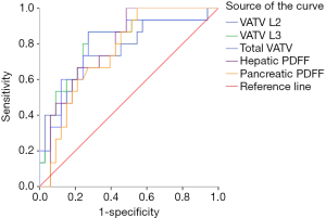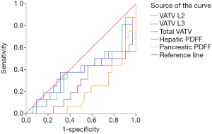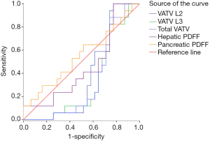 The ROC curves of VATV L2, VATV L3, total VATV, hepatic PDFF, and pancreatic PDFF failed to predict the presence of prediabetes (VATV L2: P=0.16, VATV L3: P=0.05, total VATV: P=0.06, hepatic PDFF, P=0.64; and pancreatic PDFF, P=0.57, Figure 4) and NGT (VATV L2: P=0.16, VATV L3: P=0.20, total VATV: P=0.20, hepatic PDFF, P=0.07; and pancreatic PDFF, P=0.16, Figure 5).