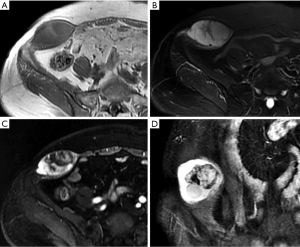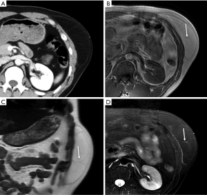 Metastases are the most common malignant lesions encountered in the anterior abdominal wall. The imaging characteristics of abdominal wall metastases are nonspecific, but they often resemble the known primary disease in other sites. The single most consistent discriminating feature is the rapid growth of lesions in a known cancer patient, who is usually at an advanced stage and has multiple other metastases. Metastasis of the umbilicus is known as Sister Mary Joseph’s nodule and typically originates from cancers of the gastrointestinal tract and ovary (52-54). The proposed metastasis route of Sister Mary Joseph’s nodule is along with the remnant structures at the umbilicus (55,56). Metastasis to the surgical wound or laparoscopic trocar site and needle-tract seeding after radiofrequency ablation also lead to the formation of abdominal wall metastases (Figure 10). These specific metastases may not be associated with widespread disease in contrast to hematogenous abdominal wall metastases.