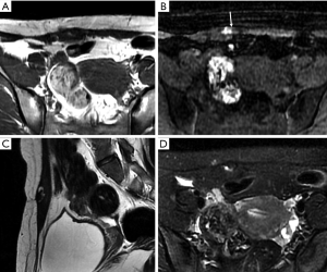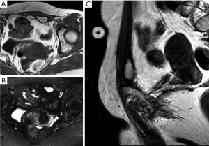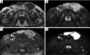 Schwannomas and neurofibromas are the two main types of benign PNSTs, and they are difficult to distinguish on imaging (39,40). The histological hallmark of schwannomas is the presence of Antoni A and Antoni B regions. Antoni A areas are hypercellular and composed of spindle cells, while Antoni B regions are hypocellular, contain more myxoid tissue, and have a high water content (41,42). Large schwannomas commonly undergo degenerative changes, including cyst formation, calcification, hemorrhage, and fibrosis (43). Therefore, myxoid areas with high T2 SI and degenerative regions are more common in schwannomas than in neurofibromas. However, “target signs” are more common in neurofibromas than in schwannomas (44). Occasionally, a schwannoma can be distinguished from a neurofibroma by its location relative to a nerve; schwannomas may be eccentrically adjacent to and separable from the nerve, whereas a neurofibroma may be integrated with the nerve (45).