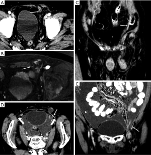 Although the clinical diagnosis of abdominal hernias is relatively easy, CT or MRI can help distinguish between abdominal hernias and abdominal or abdominal wall tumors by showing the herniation of fat or intestines through the fascial defect, in addition to complications of intestinal fistulas, such as ischemia and obstruction (59). As an interesting finding in our routine work, CT can be used to identify the inferior epigastric artery and can help distinguish oblique and direct hernias, which is important for surgery (Figure 12).
