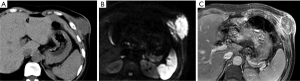 Lymphomas may involve the skin, subcutaneous tissues, and muscles of the abdominal wall by contiguous extension or as isolated nodules. Lymphomas on CT or MRI often appear as multiple nodules with relatively homogeneous density or SI. The lesions also show homogeneous and moderate enhancement after administration of a contrast agent. On DWI, lymphomas have a hyperintense signal; i.e., the lesions have a lower apparent diffusion coefficient (ADC), which represents restricted free diffusion of water molecules (Figure 11). This restriction is likely because lymphomas have high cellularity and large abnormal nuclei and are therefore observed as more densely packed tissue (57). The diagnosis is primarily based on diffuse or systemic involvement.