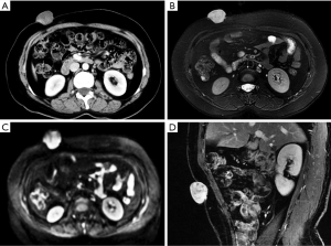 Remarkably, most abdominal wall masses can be easily detected by palpation or US, and biopsy can be used to obtain tissue for histological analysis. However, CT and MRI have advantages during presurgical planning due to their ability to determine the mass size, location, and relationship with adjacent anatomical structures. For some lesions, CT and MRI can detect pathognomonic signs, such as pure fluid, fat, blood products, phleboliths, and feeding or draining vessels. These imaging features and information on clinical characteristics are extremely valuable for presurgical diagnosis and can be a beneficial complement to biopsy results, which may be indefinite due to the sample location and size, especially in soft tissue tumors.