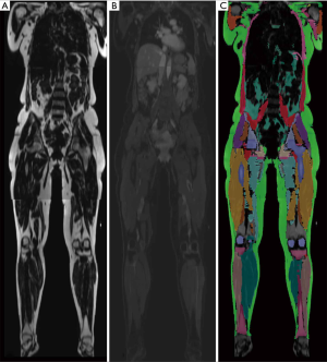 The current EWGSOP consensus paper focuses on qualitative methods of MRI for muscle BCP profiling (91). Most importantly, intermuscular adipose tissue (Figure 3)—often measured at mid-thigh level—is a parameter that has already been investigated extensively using threshold-based measurements in CT (95). When derived from MR images it has also been shown to correlate with mortality and other disease outcome measures (96) and may thus be the focus of further BCP studies. The fact that it is reliable in the assessment of sarcopenic muscles (97) and can be evaluated from a single slice (98,99) may prove beneficial for the use of BCP profiling and muscular assessment with MRI. Common qualitative and quantitative measures of BCP in WB-MRI are as follows: