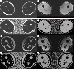 In addition to the plain large-scale separation of mainly fat and water containing body compartments, precise assessment of intra- and intermuscular fat can be obtained with higher spatial resolution. Though sometimes misleadingly used synonymously, these two quantitative descriptors of adipose tissues are defined as presence of macroscopic fat within/between fibers of one muscle (i.e., real fatty muscle infiltration, also named “interstitial fat”) and of adipose tissue that accumulates between muscle groups underneath the deep fascia, respectively (44,45). While intramuscular fat is more difficult to image, these types of fat deposition are known to be associated differently with several physiologic and pathologic conditions. For example, intramuscular fat content is twice as high after spinal cord injury, compared to healthy controls (46). On the other hand, intermuscular fat is sometimes referred to as “bad” adipose tissue, as it correlates stronger with visceral adipose tissue and is hence linked to the metabolic disease spectrum, and furthermore serves as a good predictor of insulin sensitivity (47). Moreover, over the past two decades, different groups have demonstrated quantitative changes of intramuscular fat in diseases from the spectrum of neuromuscular disorders, most commonly muscular dystrophies (48). Dahlqvist et al., for example, proved that fat fraction derived by chemical shift imaging of paraspinal and other muscles in facioscapulohumeral dystrophy patients, correlated with clinical and genetic disease markers, even when symptoms did not (49). Another group used three-point Dixon for quantification of intramuscular fat fraction in Duchenne muscular dystrophy. The result was a stronger correlation with a validated disease severity score than any other tested clinical examinations, such as isokinetic dynamometry of the knee extensor strength (50).