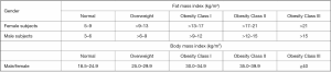 FMI is calculated as the total body fat mass with height2 adjustment. The use of FMI has been advocated to diagnose obesity, similarly to what done by BMI. The rationale of using FMI is based on the assumption that BMI, despite its ease of use, is not a direct adiposity measurement parameter (25). On the contrary, despite the use of FMI (which is a direct measurement of adiposity) has its rationale, there is an ongoing debate about what cut-off point should be used to better diagnose obesity. Figure 3 compares BMI thresholds to a list of FMI cut-off points proposed for defining obesity categories both for male and female subjects using FMI, according to the National Health and Nutrition Examination Survey (NHANES) reference values (42). Nevertheless, it is still unclear which associations exist between such thresholds and obesity related negative outcomes. Despite this, FMI has a clear advantage over BMI for the evaluation of obesity, as the latter does not take into account patients’ lean mass.