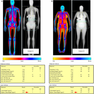 Recent evidence of the possible concurrent presence of low BMD (osteopenia or osteoporosis), reduced muscle mass (sarcopenia), and increased adiposity (obesity) led the scientific community to propose a new term, the so-called “osteosarcopenic obesity” (50). As a matter of fact, DXA is currently the only technique which is capable of identifying all these conditions at the same time, by evaluating the presence of low ASMMI together with adipose indices (such as FMI) and BMD (with DXA performed at lumbar spine and femur). Figure 4 compares two subjects with reduced muscle mass according to ASMMI values, but with different percentage of fat mass as evaluated with FMI.