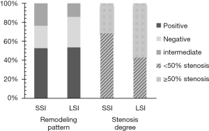 All the statistical analyses were performed using SPSS software (version 25.0, IBM SPSS, Chicago, IL, USA). Fisher’s test was performed to evaluate the difference in the percentage of quadrants with plaque formation, PB, remodeling pattern, and degree of stenosis between the SSI and LSI groups. The Wilcoxon signed-rank test was performed to determine the difference in PB between the two groups. A two-tailed P value ≤0.05 was considered to indicate a significant difference.