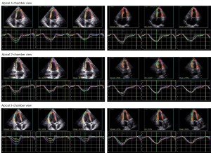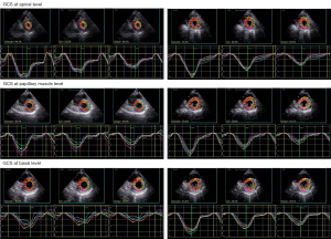 Two-dimensional STE was performed using a GE VIVID E95 ultrasound system. Images of the apical four-chamber, apical two-chamber, apical LV long-axis, and LV short-axis views at the basal, papillary, and apical levels were collected within 3–5 cardiac cycles. The software package EchoPAC (version 201 6.3, GE Vingmed Ultrasound) was used to analyze images. Software tracked the endocardium outline and divided the whole ventricle wall into three layers (an endocardial, a mid-myocardial and an epicardial layer). Quantitative myocardial parameters for the global longitudinal strain (GLS) and global circumference strain (GCS) of each layer, and PSD, were obtained. STE data analyses were conducted by two investigators (TL and ZW) who had experience with layer-specific STE and were blind to the clinical data.