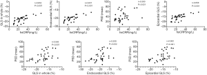 Correlation analysis showed that endocardial GLS, whole layer GLS, epicardial GLS, and PSD correlated with high-sensitivity CRP (hsCRP) levels in SLE patients, but not in healthy controls. PSD also correlated with the three layer-specific GLS parameters above (Figure 3). Partial correlation analysis showed that PSD correlated with epicardial GLS, but not with whole layer GLS or endocardial GLS, when treating hsCRP level, renal involvement, aPL profile, and disease activity as control variables (Table 5). Multivariate regression analysis showed that hsCRP level and epicardial GLS are the predictors of layer-specific GLS impairment and PSD change, respectively (Table 6).