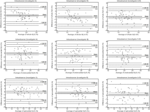 Intra-observer variabilities and inter-observer reliability for whole GLS, endocardial GLS, and epicardial GLS were analyzed by a Bland-Altman plot presented (Figure 4), and were all within the limits of agreement.