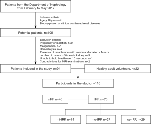 This prospective study was approved by the Medical Ethics Committee of Peking Union Medical College Hospital (Ethical No.: ZS-1271), and written informed consent was obtained from each participant. From February 2017 to May 2017, patients were randomly and consecutively recruited from the Department of Nephrology in our hospital. The inclusion criteria were as follows: (I) age ≥18 years old; and (II) biopsy-proven or clinically confirmed renal diseases, including Gitelman syndrome, immunoglobulin (Ig) A nephropathy, CKD, IgG4 nephropathy, malignant hypertension, acute kidney injury, and antineutrophil cytoplasmic antibodies (ANCA)-associated systemic vasculitis. The exclusion criteria included pregnancy, lactation, malignancies, hemodialysis, renal tumors with maximal diameter >1 cm or number of renal tumors >5 in each kidney, and patients unable to hold their breath for over 10 seconds, and general contradictions for MRI examination.