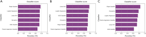 We compared six machine-learning classifiers, including Ridge Classifier, LogisticRegression, LinearSVC, Perceptron, SGDClassifier, and PassiveAggressiveClassifier. Five-fold cross-validation was used to compare the performance (prediction accuracy) of different machine-learning classifiers and help to select the optimal one. Receiver operating characteristic (ROC) analysis was performed, and the area under the ROC curve (AUC) was calculated for each comparison. The Delong test was used to calculate the 95% confidence index (CI) of the ROC curves. A two-sided P<0.05 indicated a statistically significant difference.