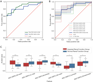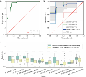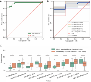 To distinguish between mi-IRF (n=14, 60≤ eGFR <90 mL/min/1.73 m2) and mo-IRF (n=27, 30≤ eGFR <60 mL/min/1.73 m2), nine texture features were selected, including seven features quantified from the ADC map and one feature quantified from the T1 map to build the classifier (Table 4). The classifier produced an AUC of 0.937 [95% confidential interval (CI): 0.864–1], an accuracy of 0.878, a sensitivity of 0.889, a specificity of 0.857, an NPV of 0.800, and a PPV of 0.923 to differentiate between mi-IRF and mo-IRF (Table 2). The ROC curves with cross validation are shown in Figure 5A,B, and the distribution plot of the selected texture features in the mildly and moderately impaired renal function groups is demonstrated in Figure 5C.