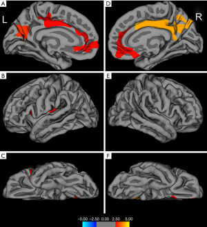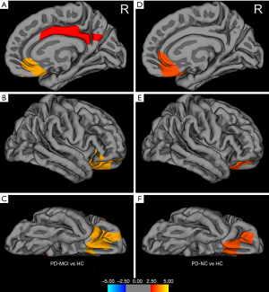 Previous in vivo MRI studies investigating cortical thickness between PD-MCI, PD-NC, and HC groups have found that the pattern of cortical thinning in PD-MCI patients included the frontal, insular, and parietal–temporal regions (25-27,61). However, we found no significant differences in cortical thinning across groups; and similar results were also reported in some studies with small sample sizes (62,63). Otherwise, the mean duration of PD was approximately 3 years, the average age of the groups was approximately 60 years, and individuals with these characteristics tended to have mild cortical changes (29,64). Thus, these reasons may take account of why there was no significant difference in the comparison of cortical thickness.