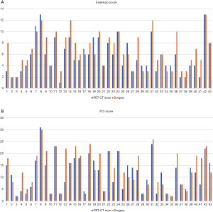 The median [range] Eisenkop score on PET/CT scan and surgical findings were 5 [1–13] and 6 [2–13], respectively. PET/CT scans correctly predicted the Eisenkop score with high sensitivity (84.2%), specificity (87.0%), and accuracy (85.1%) (Table 2 and Figure 1A). The median (range) PCI score on PET/CT scans and surgical findings were 12 [2–31] and 12 [2–30], respectively. The diagnostic accuracy of PET/CT scans for PCI scores was lower (78.5%), with 72.7% sensitivity and 84.9% specificity (Table 3 and Figure 1B).