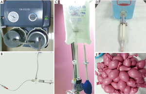The ultrasound-guided aspiration auxiliary device consisted of a YB-DX23D negative pressure aspirator (SMAF, Shanghai, China), a pressurized infusion bag with a pressure range of 0–300 mmHg, and a three-way valve. Voluson S8 (GE Healthcare, Wauwatosa, USA) with a transducer of RIC5-9W-RS (3.9–8.0 MHz) was used for imaging. Other supplies included physiological saline, coupling agent, syringes (5 mL and 30 mL), disposable infusion sets, condoms, rubber balloons, dressing boxes, follicular puncture needles (17 G), and infusion stands (180 cm). A 5 mL syringe was connected to the hose connector of the negative pressure aspirator. A disposable infusion set was connected to the physiological saline bag (100 mL) used for flushing. Finally, the three-way valve was used to form the device by connecting the two parts mentioned above.