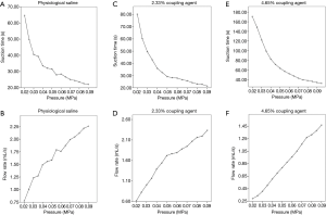 Pressure, ranging from 0.02–0.095 MPa, was used to aspirate physiological saline, the 2.33% coupling agent solution, and the 4.65% coupling agent solution. The suction times were recorded. Meanwhile, physiological saline was infused under pressure (20–300 mmHg), and the infusion times were recorded. The following calculation formula was used: Flow rate = volume/time (mL/s).