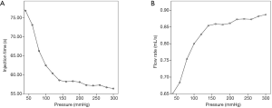 When the pressure was raised to 140 mmHg and above, the rate of decrease in the injection time and the rate of increase in injection velocity were gradually diminished (Figure 4).