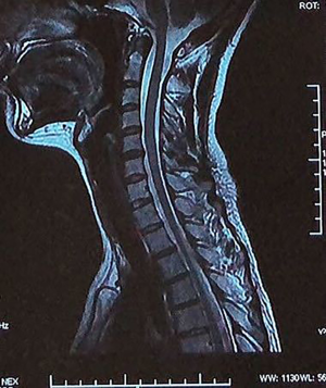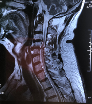 A 65-year-old male without significant past medical history presented to the outpatient department with a chief complaint of difficulty walking for more than 10 months’ duration, and neck and shoulder pain for 40 years. Physical examination showed bilateral upper extremity hyperreflexia, bilateral Babinski reflex, a positive Hoffman’s test, and a decrease in multidermatomal upper extremity sensation during pinprick testing. Furthermore, decreased grip strength and compromised coordination was noted, evidenced by altered gait pattern. Radiographic examination of the cervical spine showed a loss of activity in the PAOI on X-ray (ratio of PAOI = ~0.6). The MRI demonstrated the presence of severe spinal compression in C4/5. The patient elected to undergo cervical surgical treatment.
