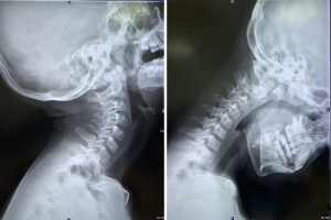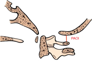A 12-year-old boy with a chief complaint of neck and shoulder pain for more than 2 years presented to our hospital. The patient was neurologically intact, and the physical examination showed a limited cervical range of motion. Although the hyperflexion-extension plain film examination showed no instability, an increase in the ratio of PAOI (PAOI = ~1) and extremely small PAOI distance were observed. In addition, the patient was found to have cervical curvature changes and mild cervical disc degeneration on MRI scans. Conservative treatment was initiated.