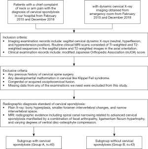 Cases in group B without cervical spondylotic myelopathy were selected from the emergency room. The included cases were selected by reviewing the imaging database from February 2015-December 2018 until group B included more than 40 cases. Cases with cervical spinal abnormalities, fractures, dislocations, or a history of previous or current neurological symptoms related to the cervical spine were eliminated. Group B consisted of cases without reported imaging changes or degenerative manifestations. Cases in the 2 groups with (I) any previous history of cervical spine surgery, (II) any developmental cervical malformation, such as Klippel Feil syndrome, (III) any congenital or acquired occipitocervical fusion, and (IV) missing data from any of the examinations we required were excluded from this study.