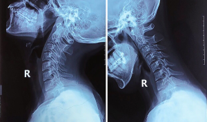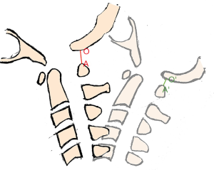 All X-ray images obtained in our institution were interpreted and diagnosed by experienced radiologists. The radiographic analysis included measuring the dynamic interval ratio and the range of motion (flexion-extension) using the following methods: (I) the interval ratio, defined as the ratio between the PAOI at the hyperflexion position and hyperextension position, as demonstrated in Figure 3; PAOI ratio = distance at hyperextension position (A'O')/distance at hyperflexion position (AO), and (II) the range of motion, which was the angle measured as the sum of 2 angles between the C2 and C7 posterior vertebral edge at flexion and extension position. The radiographic data from all cases were measured by 2 experienced, independent observers from our department twice to reduce intra- and inter-observer bias, and the mean values were determined and utilized.