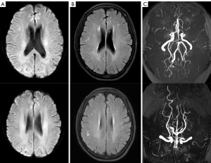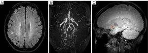 At the time of admission for query stroke in 2004, the patient’s initial brain magnetic resonance imaging (MRI) showed only a few small foci of white matter microangiopathic changes (Figure 1A), with no acute infarction on diffusion-weighted imaging (DWI) (Figure 1B). However, incidental time of flight-magnetic resonance angiography (TOF-MRA) findings of her brain demonstrated occlusion of the bilateral middle cerebral arteries (MCAs) and stenosis of the distal ICAs, with normal anterior cerebral arteries (ACAs) and posterior cerebral arteries (PCAs) (Figure 1C). She was diagnosed with severe intracranial atherosclerosis disease, which was managed conservatively with atorvastatin and aspirin. In the following years, the patient underwent regular imaging surveillance to monitor disease progression. Her recurrent TIAs raised concern, and clinicians considered whether it was feasible for her to receive more aggressive surgery or interventional therapy. In recent years, the condition of her vessels has been reevaluated by multi-sequence MRI, as she is allergic to iodine. The steno-occlusive severity of the patient’s intracranial arteries was assessed by MRA stages for MMD (7). The MRA stages were mainly determined by TOF-MRA maximum intensity projection (MIP) images, with source images used referentially. On the MRA, the steno-occlusive changes of the MCAs, ACAs and PCAs were graded as 3 stages (7): stage 1= no or mild stenosis (<50%), stage 2= moderate stenosis (>50%) but with intact distal segment, and stage 3= severe stenosis without any apparent distal segment. The patient’s moyamoya-type vasculopathy could be classified as stage 3. Surprisingly, the “ivy sign” was not very prominent on fluid-attenuated inversion recovery (FLAIR) images (Figure 2A). It is well known that the “ivy sign” is the result of the slow-flowing leptomeningeal collaterals that can be detected in MMD (8). Although the characteristic “puff of smoke-like” moyamoya vessels were not apparent, her bilateral PCAs were very thick and several branches could be seen originating from the bilateral PCAs and vertebrobasilar arteries (Figure 2B), which could be interpreted as evidence of the development of collaterals from the posterior circulation. High-resolution vessel wall imaging confirmed the intimal thickening and luminal occlusion of MCAs (Figure 2C). The patient’s overall imaging findings were not typical for MMD. With consideration to her medical history, the patient was eventually diagnosed with MMS by a multidisciplinary team (MDT) composed of neurologists, neurosurgeons and diagnostic and interventional radiologists.