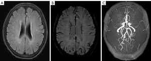 In recent years, the patient has been monitored with frequent MRI scans under the latest noninvasive clinically available MRI techniques, such as susceptibility-weighted imaging (SWI) and arterial spin labeling (ASL). Since 2013, ASL and other MRI sequences have been carried out as routine MRI examinations on a 3.0-Tesla MRI scanner (Ingenia, Philips, Amsterdam, The Netherlands) with 16-channel head coils. Multiple brain MRIs have shown nonprogressive small white matter ischemic foci (Figure 3A), while SWI has revealed no associated microhemorrhage (Figure 3B). TOF-MRA has consistently shown the presence of collaterals from bilateral PCAs and vertebrobasilar arteries (Figure 3C).