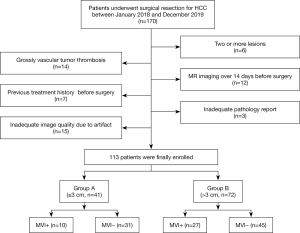 This single-center retrospective study was approved by the Institutional Review Board at our institution and the informed consent requirement was waived. The study was conducted in accordance with the Declaration of Helsinki (as revised in 2013). From our institution’s medical database, we identified 170 patients with HCC undergoing surgery and preoperative contrast-enhanced MRI between January 2018 and December 2019. In total, 113 consecutive patients were selected based on the following inclusion criteria: (I) histologically confirmed single HCC without evidence of gross vascular invasion on MRI; (II) no treatment before surgery; (III) gadoteric-acid-enhanced MRI within 14 days before surgery; (IV) HCC with full histological description available in the pathological report; and (V) good image quality (Figure 1).