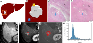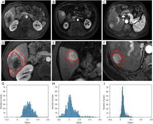 All patients underwent contrast-enhanced MRI using a 3.0-Tesla MR system (Ingenia, Philips Healthcare, Netherlands) with a 32-channel phased-array coil. Firstly, an axial T2-weighted single-shot turbo spin-echo sequence with a fat-suppressed respiratory trigger was performed for routine liver MRI with the following parameters: repetition time (TR)/echo time (TE) =1,000/70 ms, slice thickness/gap =7/1 mm, field of view (FOV) =400 mm × 350 mm, and matrix size =208×207. Secondly, an axial dual-echo T1-weighted fast field-echo with breath-hold was also performed with TR/TE1/TE2 =8.7/1.15/2.3 ms, slice thickness/gap =7/1 mm, FOV =400 mm × 350 mm, and matrix size =252×211. Finally, a fat-suppressed dynamic 3D T1-weighted sequence (TR/TE =3.7/1.32 ms, slice thickness/gap =4/−2 mm, FOV =400 mm × 350 mm, matrix size =252×207) with volumetric interpolation and breath-hold was performed before and after bolus injection of 0.1 mmol/kg gadoteric acid (Hengrui Pharmaceutical Co., Ltd., Jiangsu, China) with a flow rate of 2 mL/s. The dynamic enhanced sequence was performed among several phases including the pre-enhanced phase, AP (25 s), portal venous phase (55 s), equilibrium phase (90 s), and delayed phase (180 s).