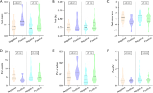 Occasionally, the subtle signal changes are not easily visible surrounding a tumor for radiologists, histogram features can provide more imaging details and assist doctors in diagnosis as a more sensitive quantitative approach (14,15,19,23). In this study, peri-mean was an independent predictor of MVI in both cohorts (sHCC and HCC >3 cm). These results suggested that the mean degree of the peritumoral enhancement signal was associated with MVI: With the increase in peri-mean value, the possibility of MVI was greater. It may be related to peritumoral hemodynamic changes caused by positive MVI, and the enhancement degree of peritumoral is enhanced, reflecting the increase of peri-mean. Particularly in sHCC, only the peri-mean feature is taken as an independent predictive factor, and the diagnostic efficiency achieved a satisfactory result (AUC: 0.798). In addition, the sensitivity was up to 100%, which may have significant clinical implications. Therefore, for sHCC patients, we suggest that a more cautious treatment strategy should be chosen for those with a peri-mean value higher than 0.083 (cutoff value), to avoid postoperative recurrence caused by non-anatomical hepatectomy. In addition, radiofrequency ablation was also not recommended for these sHCC patients.