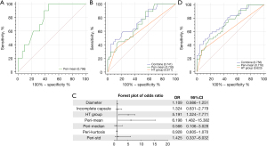 The ROC curves based on the selected independent factors in sHCC and HCC >3 cm are shown in Figure 5. The parameters including AUC, sensitivity and specificity for each predictor are listed in Table 5. In the sHCC cohort, peri-mean alone had an AUC of 0.792 (P=0.0001) with a sensitivity and specificity of 100.00% and 54.84%, respectively (Figure 5A). When the peri-mean and CET group were combined, the AUC improved to 0.741 in the HCC >3 cm group, which was better than the CET group alone (AUC =0.611; P=0.01, DeLong test) but not significantly higher than the peri-mean with the AUC of 0.705 (P=0.360, DeLong test) (Figure 5B). When the univariate parameters from both sHCC and HCC >3 cm were pooled for the multiple logistic regression analysis (Figure 5C), peri-mean (OR, 6.198; 95% CI, 1.482–15.382) and CET group (OR, 5.191; 95% CI, 1.324–7.771) were significant factors for MVI in all tumors with an AUC of 0.716 and 0.623, respectively (Figure 5D). When the above two features were combined, the AUC was 0.756 with a sensitivity and specificity of 59.46% and 77.63%, respectively.