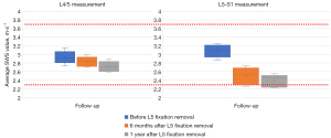 In this case, SWS decreased after screws removal for the two studied disc levels. L4/5 disc was bridged by the posterior instrumentation before removal of the L5 screws, and therefore it remained unloaded. L5/S1 disc, on the other hand, was free; hence, it was likely overloaded before fixation removal, to compensate for the reduced mobility of the instrumented segment. Loadings of both these discs changed towards physiological patterns after L5 fixation removal. With posterior-only approaches, biomechanical properties variations of the anterior annulus fibrosus may be only due to the removal of L5 fixation.