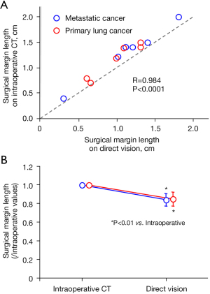 With regard to the surgical margin, although the length on intraoperative CT correlated closely with that on direct vision of the resected specimens in overall patients (Figure 6A), the margin on direct vision was significantly shorter than that on intraoperative CT in both patients with primary lung cancer and metastatic lung cancer (Figure 6B).