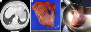 The incidence of sublobar resection for small, indistinct pulmonary nodules is increasing because of the increased frequency of performing computed tomography (CT)-based whole lung screening. Various techniques for the intraoperative localization of such indistinct lesion have been reported (1,2). However, surgeons still worry about whether or not the lesion is actually included in the resected specimen and if the surgical margin is sufficient, particularly if the lesion is impalpable or accompanied by ground glass component. Although cutting the specimens into pieces can help identify the lesions, it prevents the subsequent pathological assessment of the invasiveness of primary lung adenocarcinoma (invasive adenocarcinoma, minimally invasive adenocarcinoma, or adenocarcinoma in situ) and the accurate measurement of the surgical margin. Sawabata et al. reported that the shortage of the surgical margin in pulmonary wedge resection for lung cancer likely results in positive surgical stump cytology, leading to local recurrence (3,4). They advocated that the surgical margin of greater than the maximum tumor diameter was optimal to prevent local recurrence (3). Mohiuddin et al. also reported the importance of surgical margin length in pulmonary wedge resection for lung cancer: they did not find any postoperative local recurrence if surgical margin was more than 15 mm (5). Therefore, 15 mm (if the tumor is greater than 15 mm) or greater than the maximum tumor diameter is regarded as sufficient surgical margin in patients undergoing sublobar resection. However, the previous studies mainly subjected tumors greater than 1 cm. Furthermore, the necessary surgical margin in adenocarcinoma in situ or minimally invasive adenocarcinoma, showing ground glass component, remains unclear probably because, in practice, it may be difficult to accurately measure the surgical margin in subcentimeter tumor or tumors with ground glass component.