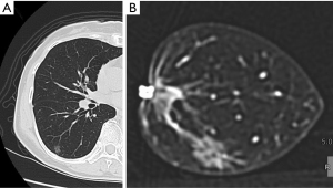 The resected specimens were inflated by the careful instillation of air. Puncture was performed at a distant site, where the pulmonary lesion was absent, using a 23-G puncture needle connected to an appropriately sized syringe. The instillation was done slowly in order to prevent alveolar wall destruction. The degree of inflation differs among specimens because air leak from the puncture site or stapled site eventually develops. After the specimen was placed in a plastic container, the specimen along with the container underwent conventional 64-detector CT (Revolution GSI; GE, Chicago, IL, USA) as soon as possible. The scan parameters were as follows: tube voltage, 80 kV; rotation time, 0.6 s; beam width, 20 mm; pitch, 1.375; slice thickness, 0.625 mm; slice interval, 0.625 mm; scan field of view (FOV), 8 cm; matrix, 512×512; recon type, HD Lung; noise index, 10. It generally takes 5 minutes or less for scanning of the resected specimen and image acquisition. The obtained images were evaluated intraoperatively in the operating room on multi-planner reconstruction images. Figures 1-3 show two representative cases with primary lung cancer.