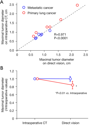 According to a correlation analysis, the maximal tumor diameter on intraoperative CT was found to be closely correlated with that on preoperative CT in overall patients (Figure 4A). According to a paired t-test, the maximal tumor diameter on preoperative CT was not significantly different from that on intraoperative CT in both patients with primary lung cancer and metastatic lung cancer (Figure 4B).