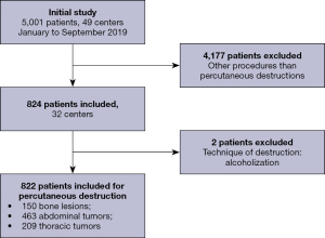 From the 5,001 patients of 49 centers of the previous study, 824 (in 32 centers) underwent tumor percutaneous destruction (Figure 1). Two patients were excluded because destruction was performed by alcoholization. A total of 822 patients, 266 women and 556 men, were included in the study, of mean age 62±14 years old. Among them, 150 had bone lesions (62 women, 88 men, mean age 40±18 years, 9 centers), 463 abdominal tumors (120 women, 343 men, mean age 67±12 years, 25 centers) and 209 had thoracic tumors (84 women and 125 men, mean age 66±12 years, 11 centers). Overall, 699 patients (85.0%) were treated for one lesion, 91 patients (11.1%) treated for 2 lesions and 32 patients (3.9%) treated for 3 or more lesions.