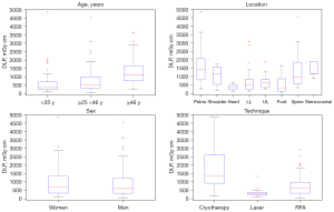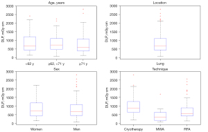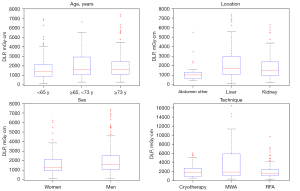 The mean total DLP was 991.6±979.0 mGy·cm for patients with bone lesions, 2,130.7±2,051.8 mGy·cm for patients with abdominal tumors and 825.2±545.4 mGy·cm for patients with lung tumors (Table 1). The mean total DLP for patients with one lesion treated was 1,509±1,619 mGy·cm, it was 2,103±2,280 mGy·cm for patients with two lesions and 1,899±2,034 mGy·cm for patients treated for 3 or more lesions (Table S1). The total DLPs obtained in univariate analysis according to gender, age and technique used are presented in Figure 2 for patients with bone lesions, and in Figures 3,4 for patients with abdominal and thoracic tumors, respectively.
