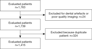 In total, the skeletal muscle mass data of 1,763 study subjects were entered in this study database. After deduplication, 1,415 unique patients were included for analysis in this study. A flow diagram of all patients evaluated and included or excluded is shown in Figure 1. Roughly two-third of patients was male, and one-third was female. Continuous variables were not normally distributed (Kolmogorov-Smirnov P<0.05). The median age of the included patients was 63.7 years at diagnosis, ranging between 19.6 and 97.6 years. The median BMI was 24.0 kg/m2 (range, 13.3–48.2 kg/m2); only a minority of patients were underweight at diagnosis with a BMI ≤18.5 kg/m2: n=129, 9.1%. This study included tumors of all tumor head and neck sites and all tumor stages. The most common diagnosis was oropharyngeal carcinoma (n=500, 35.3%), and most patients were diagnosed with a stage IV tumor (n=800, 59.4%). Significant differences between male and female patients were seen in age, height and TNM-stage. Female patients were more often older and smaller of stature and had lower of body weight and lower BMI. Male patients more often presented with stage IV disease, all P<0.01. Full patient and disease characteristics are shown in Table 1.