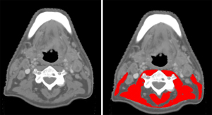 A known risk factor for adverse outcomes in HNC is a low BMI, but BMI is an imprecise measurement of individual body composition and does not reflect variances in adipose tissue and lean body mass. Modern imaging techniques such as CT and MRI can add information on the body composition of a patient and can provide detailed information on skeletal muscle mass, adipose tissue mass and its ratio. In the management of HNC patients, CT and MRI of the head and neck are the most widely used imaging modalities for routine diagnostics and clinical decision making. MRI is considered one of the most accurate methods for analyzing quantitative and qualitative changes in body composition and is associated with an error in quantifying muscle that ranges between 1.1% and 4.4% (25).