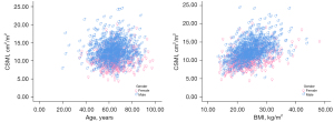 The SMA at the level of C3 and CSMI were not normally distributed (Kolmogorov-Smirnov P<0.05). SMM (CSMI) had a significantly low correlation with age at diagnosis (Spearman r2=0.1, P<0.05) and a significantly moderate correlation with BMI (Spearman r2=0.4, P<0.01) and gender (Spearman r2=0.4, P<0.01). Figure 3 shows the scatter plots of the association between CSMI and age and CSMI and BMI in females and males.