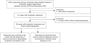 The study was conducted in accordance with the Declaration of Helsinki (as revised in 2013). The study was approved by the Ethics Committee of Beijing Shijitan Hospital, Capital Medical University, and informed consent was waived due to the retrospective nature of the study. Between January 2018 and December 2020, the clinical and imaging data of 39 patients (18 males and 21 females) diagnosed with systematic lymphatic abnormality-related osseous lesions were retrospectively reviewed at Beijing Shijitan Hospital, Capital Medical University. A total of 24 patients with generalized lymphatic anomalies and 15 patients with LM in Gorham-Stout disease were evaluated. The inclusion criteria were as follows: (I) systematic lymphatic abnormality-related osseous lesions diagnosed by a combination of clinical, radiological, and histological findings; and (II) DLG and CTL were performed. The exclusion criteria were as follows: (I) bone tumors, osteomyelitis, bone tuberculosis, and metabolic diseases such as brown tumors; and (II) DLG and CTL were not performed (Figure 1).